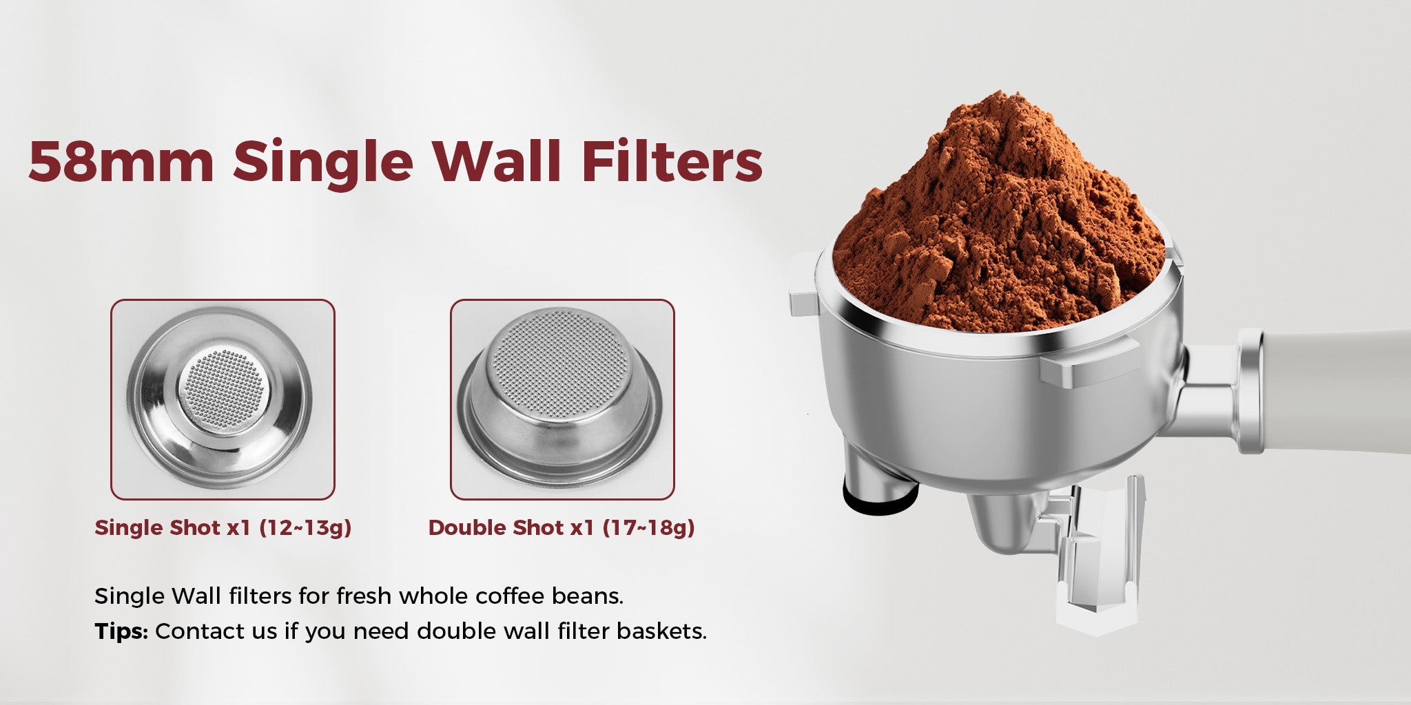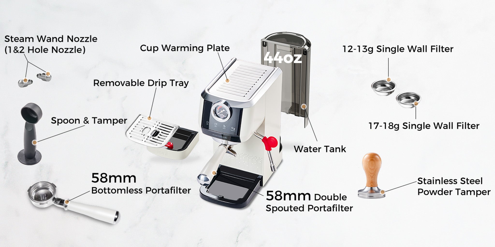 Package Included Single Cup Stainless Steel filter, Stainless Steel Steam Wand (1&2 Hole Nozzle1), Double Cup Stainless Steel filter, 58mm Double Spouted Portafilter, Measure Spoon With Tamper