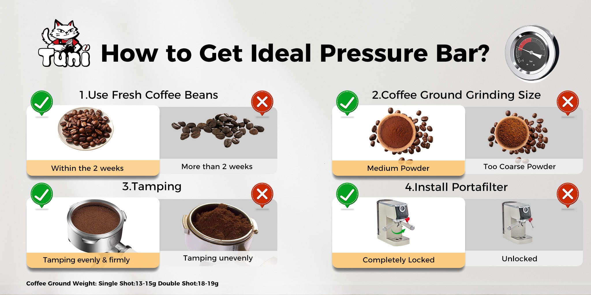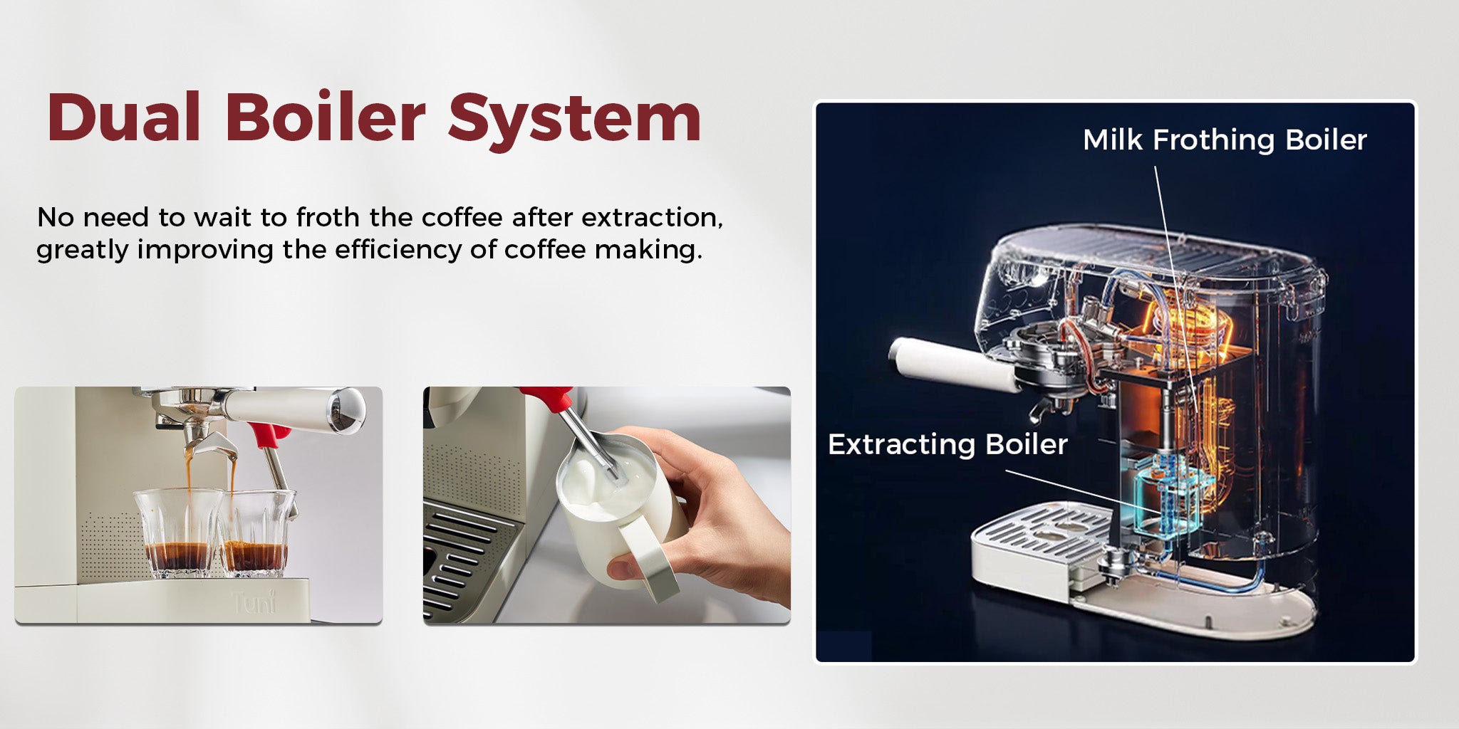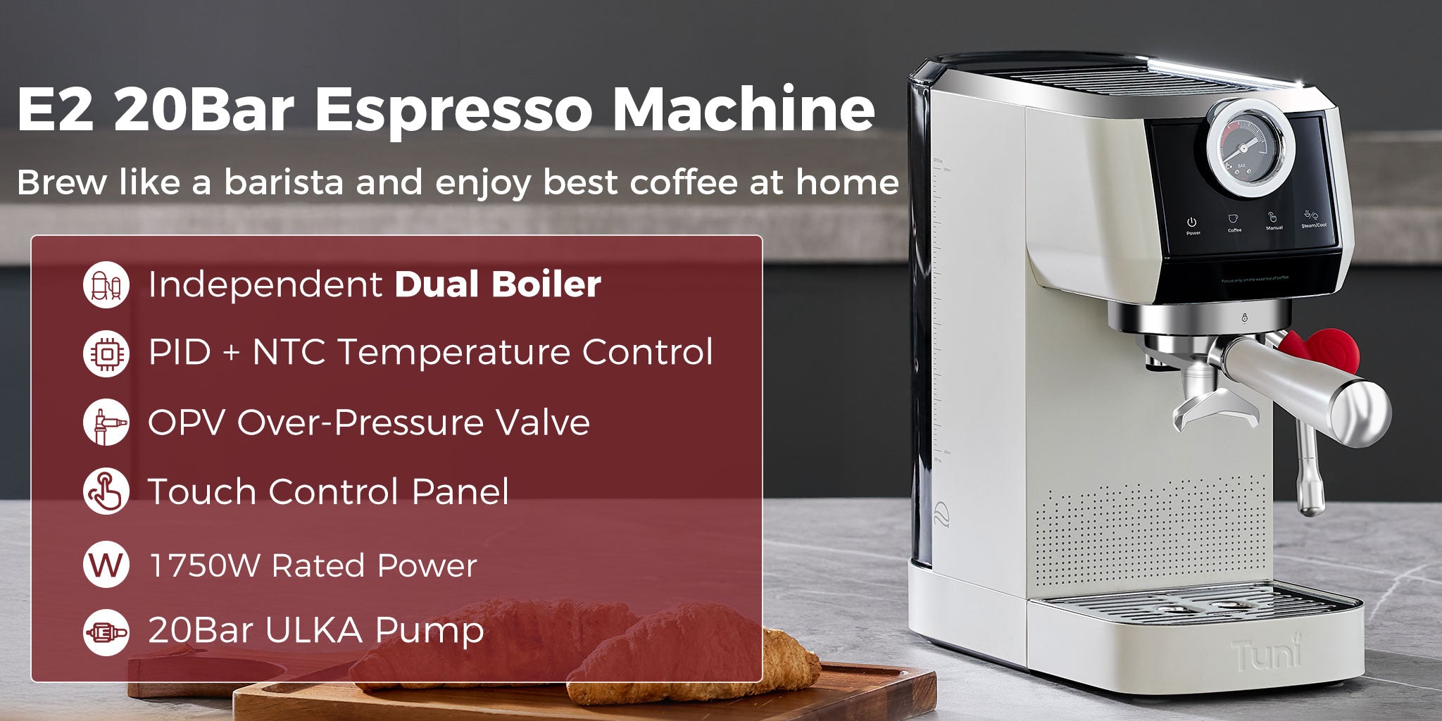 • [Dual Heating System & 20-Bar High Pressure] - The Tuni semi-automatic espresso machine heats up in just 30 seconds and extracts rich crema, letting you enjoy a delicious espresso quickly. It features an original Italian 20-bar ULKA water pump and a built-in visual pressure gauge, with precise temperature control via PID + NTC to ensure full extraction of flavor and oils, resulting in a rich and aromatic espresso.